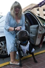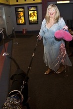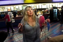Joyce McKinney looked warily at the photographer snapping her picture outside Broadway Centre Cinemas.