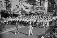 A marching made up of musicians from a variety if high schools performs in the 1947 Days Of '47 Parade.