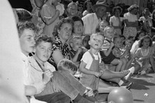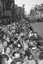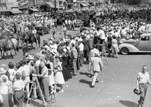 Huge crowds gather to watch the Days of '47 Parade on July 24, 1947. Note the people standing on ladders and s