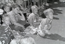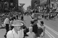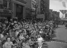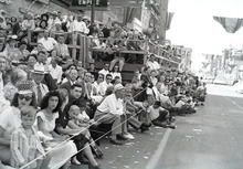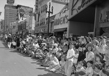 Huge crowds gather to watch the Days of '47 Parade on July 24, 1947. Note the people standing on ladders and stools to get a better view.