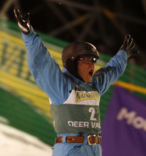 Though his score was later eclipsed by Alexei Grishin of Belarus for the gold medal, Peterson nailed his jump and skied into a swarm of wildly cheering teammates while pumping his fists in celebration.