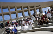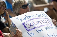 Teachers carried signs saying, "Teaching is an art, not a business" "Schools for all, not for some" and "Flunk Howard Stephenson," the Draper senator who is co-chairman of the Education Interim Committee planning to study collective bargaining and tax credits.