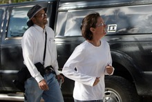 Jennifer Schellenberg smiles as she races to the Summit County Sheriff's mobile command c