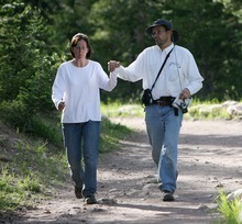 Jennifer and Aaron Schellenberg hold hands as they hike down the Crystal Lake trail after