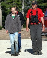 Joseph Schellenberg walks with members of  the Summit County Sheriff's department outside the mobile command center at the Crystal Lake trail head after Summit County search and rescue members found him after he wondered away from his camp site on Long Lake two miles above the Crystal Lake trail head in the Unita Mountains above Kamas, Utah Tuesday, August 2, 2011. The Schellenberg family searched all day for their son and were notified by radio that the boy was found several miles away from his camp.