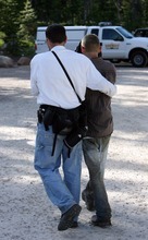 Exhausted Aaron Schellenberg walks with his son Joseph after they were reunited in the Summit County Sheriff's mobile command center at the Crystal Lake trail head  in the Unita Mountains above Kamas, Utah Tuesday, August 2, 2011. Summit County search and rescue members found Joseph about five miles from the family's camp site on Long Lake two miles above the Crystal Lake Trailhead. The Schellenberg family searched all day for their son and were notified by radio that the boy was found about several miles away from his camp.