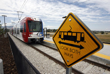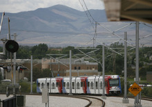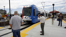 Several cities also used the preview day to ballyhoo some new development they say has been helped by the new TRAX extensions, or simply to celebrate the new trains. Among them were Midvale officials who gathered at the Bingham Junction station.
