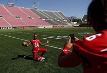 During a short break in a photo shoot, wide receiver Reggie Dunn hams it up for teammate Dres Anderson's camera. The University of Utah football team gathered for their team photo at Rice-Eccles Stadium in Salt Lake City, Utah. Saturday, August 6, 2011.