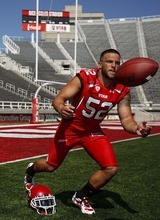Linebacker Matt Martinez, right tosses the ball after posing for a photograph. The Universi