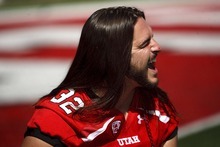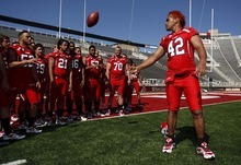 Linebacker Matt Martinez, right tosses the ball after posing for a photograph. The University of Utah football team gathered for their team photo at Rice-Eccles Stadium in Salt Lake City, Utah. Saturday, August 6, 2011.