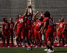 Players leap for the ball as the University of Utah football team gathered for their team p