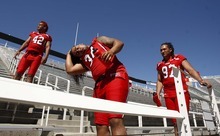 Players cool down with water as the University of Utah football team gathered for their team photo at Rice-Eccles Stadium in Salt Lake City, Utah. Saturday, August 6, 2011. At left, Nai Fotu and right is Tevita Finau. #34, center, unidentified on roster.