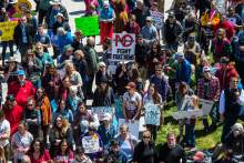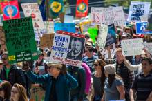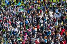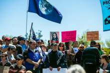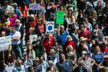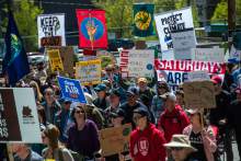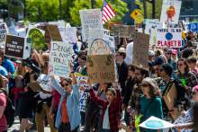 Participants rally at the Salt Lake City library during the Utah People's Climate March Saturday, April 29, 2017.