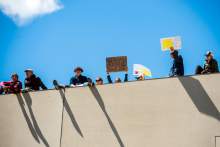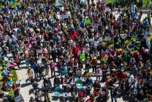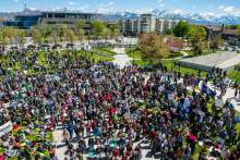 Participants rally at the Salt Lake City library during the Utah People's Climate March Sa