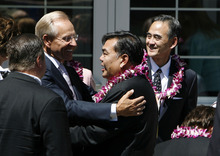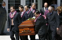In the service's conclusion, a Hawaiian male duo performed the "Aloha" song with acoustic guitars as a fitting farewell, then the organ played "God Be With You 'Til We Meet Again" as mourners quietly filed out.
