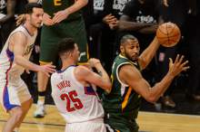 Utah Jazz center Rudy Gobert (27) defends LA Clippers guard Chris Paul (3) as the Utah Jazz