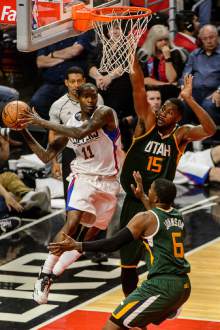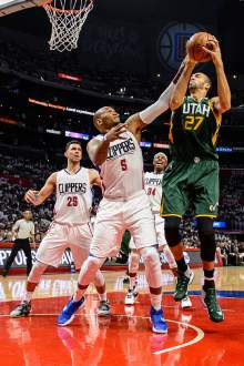 Utah Jazz center Rudy Gobert (27) defended by LA Clippers center DeAndre Jordan (6) as the
