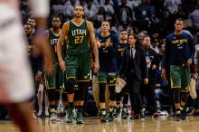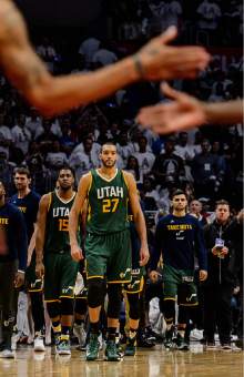 Utah Jazz center Rudy Gobert (27) picks up his third foul as the Utah Jazz face the Los Ang