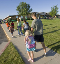 Parents walk with their children to Arcadia Elementary at 3461 W. 4850 South in Taylorsville