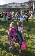 Parents walk with their children to Arcadia Elementary at 3461 W. 4850 South in Taylorsville on Wednesday, Aug. 31. Students, parents, school officials and UDOT kicked off "Walk More in Four," an annual statewide safe walking and biking to school challenge. This year the competition encourages all Utah K-8 students to safely walk or bike to school at least three days each week during the four weeks in September. The program offers a $500 prize for the school with the most participation. Additionally, students chart their progress for a chance to win prizes, including helmets, scooters and bikes.
