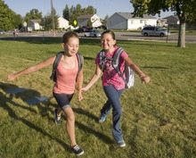 Sixth-grade friends Sierra Unsworth, left, and Brooklyn Orrillo run hand in hand to the "Walk to School" celebration at Arcadia Elementary at 3461 W. 4850 South in Taylorsville on Wednesday, Aug. 31. Students, parents, school officials and UDOT kicked off "Walk More in Four," an annual statewide safe walking and biking to school challenge. This year the competition encourages all Utah K-8 students to safely walk or bike to school at least three days each week during the four weeks in September. The program offers a $500 prize for the school with the most participation. Additionally, students chart their progress for a chance to win prizes, including helmets, scooters and bikes.
