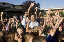 Robert Hall, Director of Traffic Safety for UDOT, center, is surrounded by students promising to walk to school at Arcadia Elementary at 3461 West 4850 South in Taylorsville Wednesday morning August 31. Students, parents, school officials and UDOT kicked off "Walk More in Four," an annual statewide safe walking and biking to school challenge. This year the competition encourages all Utah K-8 students to safely walk or bike to school at least three days each week during the four weeks in September. The program offers a $500 prize for the school with the most participation. Additionally, students chart their progress for a chance to win prizes including helmets, scooters and bikes.