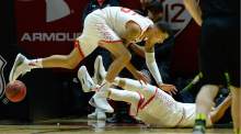Utah Utes forward Kyle Kuzma (35) and Utah Utes guard Lorenzo Bonam (15) collide during