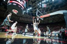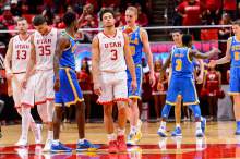 Utah Utes forward David Collette (13), forward Kyle Kuzma (35), and guard Devon Daniels (3) react to the loss as the University of Utah hosts UCLA, NCAA mens basketball at the Huntsman Center in Salt Lake City, Saturday January 14, 2017.