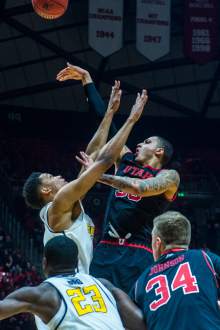 Utah Utes forward Kyle Kuzma (35) and Utah Utes guard Lorenzo Bonam (15) collide during a rebound attempt against the Oregon Ducks during the first half of the NCAA college basketball game at the Huntsman Center in Salt Lake City, Thursday, Jan. 26, 2017.