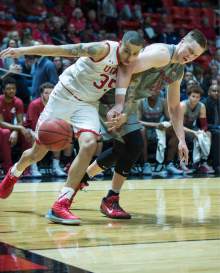 Utah's Kyle Kuzma knocks the ball out of bounds away from Washington State's Josh Hawkinson during a game between Utah and Washington State at the Huntsman Center in Salt Lake City, Thursday, Feb. 9, 2017.