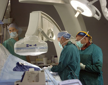 On Friday, a team led by cardiac surgeon Peter Weiss placed a pager-size stimulator device in Ross' chest, just below his left collarbone, then threaded a sensor wire through his arm's subclavian vein into his heart.