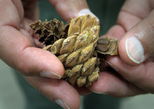 The nursery handles them in a room of machines resembling a high school wood shop. The cones, sealed tight by purple resin, first require warm air drying and then plucking by hand. The seeds, the size of big corn kernels, then get an X-ray to see if they're mature.
