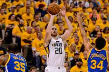 Utah Jazz forward Gordon Hayward (20) shoots as the Utah Jazz host the Golden State Warriors in Game 3 of the second round, NBA playoff basketball in Salt Lake City, Saturday May 6, 2017.