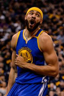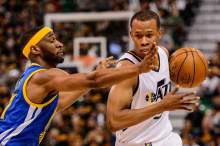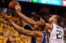 Golden State Warriors forward David West (3) and Utah Jazz center Rudy Gobert (27) as the U