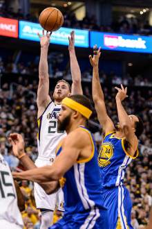 Utah Jazz forward Gordon Hayward (20) shoots over Golden State Warriors guard Shaun Livings