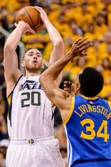 Utah Jazz forward Gordon Hayward (20) shoots over Golden State Warriors guard Shaun Livingston (34) as the Utah Jazz host the Golden State Warriors in Game 3 of the second round, NBA playoff basketball in Salt Lake City, Saturday May 6, 2017.