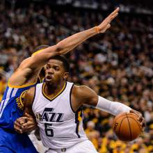 Utah Jazz guard Rodney Hood (5) defended by Golden State Warriors guard Ian Clark (21) as the Utah Jazz host the Golden State Warriors in Game 3 of the second round, NBA playoff basketball in Salt Lake City, Saturday May 6, 2017.