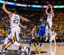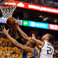 Golden State Warriors forward David West (3) and Utah Jazz center Rudy Gobert (27) as the Utah Jazz host the Golden State Warriors in Game 3 of the second round, NBA playoff basketball in Salt Lake City, Saturday May 6, 2017.