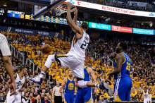 Utah Jazz center Rudy Gobert (27) dunks the ball as the Utah Jazz host the Golden State Warriors in Game 3 of the second round, NBA playoff basketball in Salt Lake City, Saturday May 6, 2017.