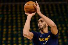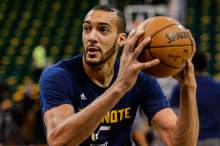 Utah Jazz center Rudy Gobert (27) warms up as the Utah Jazz host the Golden State Warriors