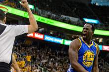 Golden State Warriors forward Draymond Green (23) reacts to his second foul as the Utah Jazz host the Golden State Warriors in Game 3 of the second round, NBA playoff basketball in Salt Lake City, Saturday May 6, 2017.