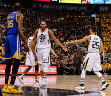 Utah Jazz center Rudy Gobert (27) and Utah Jazz guard Raul Neto (25) high-five as the Utah Jazz host the Golden State Warriors in Game 3 of the second round, NBA playoff basketball in Salt Lake City, Saturday May 6, 2017.