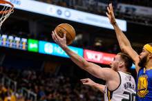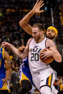 Utah Jazz forward Gordon Hayward (20) is fouled by Golden State Warriors center JaVale McGe
