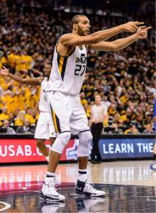 Utah Jazz center Rudy Gobert (27) looks for a call as the Utah Jazz host the Golden State Warriors in Game 3 of the second round, NBA playoff basketball in Salt Lake City, Saturday May 6, 2017.