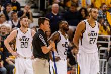 Utah Jazz forward Gordon Hayward (20), Utah Jazz guard Shelvin Mack (8) and Utah Jazz center Rudy Gobert (27) look on in the final minute, down ten points as the Utah Jazz host the Golden State Warriors in Game 3 of the second round, NBA playoff basketball in Salt Lake City, Saturday May 6, 2017.