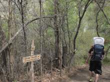 If you want to get the incline out of the way early, start from the low side at the Coyote Hollow Trailhead and follow the signs for the Canyon Hollow Trail. The trail winds through the trees east and north. At about the halfway point, the trail bends toward the southeast. About two-thirds through the hike, you will see signs directing you to Ghost Falls. It's a short side trip worth taking to see the modest waterfall. After the falls, you can follow the signs continuing the Canyon Hollow Trail. The trail ends at the road leading to the Ghost Falls Trailhead. If you wish to hike all the way to the Ghost Falls Trailhead, follow the road east and north for six-tenths of a mile.