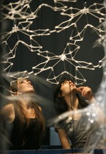 Sensors in the sculpture's plumes track visitors' movements, then the impulses are transmitted through the sculpture's neural network much as ripples spread in a pond. Like human muscle fibers, shape-memory alloys in the fronds flex, some pumping air through a rudimentary "great lung," complete with suspended flasks of metallic chemicals that exchange gases with the atmosphere.