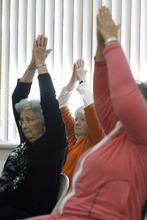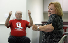 The way she teaches is sanctioned by the Arthritis Foundation, and involves about 35 minutes of slow, gentle stretching and agility moves with soft harp music playing in the background. Recently she put a group of women through the routine at the Mt. Olympus Senior Center in Holladay, but she also teaches elderly people in wheelchairs who live in a senior residence.