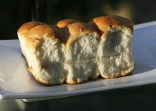 These fireplugs are about 4 inches tall, 3 inches wide and 3 inches deep. They are baked in sets of six, and the tops and bottoms are golden brown. Pulling one apart reveals a soft, pillowy interior with small holes. The shape and smell reminded me of the mini-loaves my classmates and I got to take home from a field trip to the Wonder Bread factory when I was in grade-school. That's a good memory.