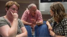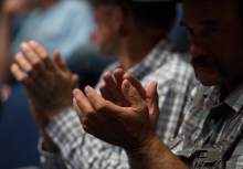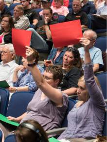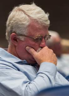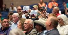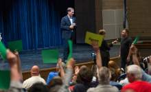 As the town hall ended, Stewart quickly slipped behind the blue curtains; the audience stood and clapped. One man from St. George stood alone at the front of the auditorium and shouted into a megaphone that he brought, "We deserve answers."